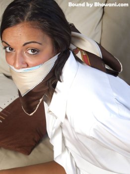 With her hands simply tied behind her back, it's time to gag Fifi - starting with a brown patterned scarf cleave gag